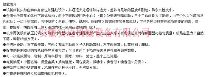 該機(jī)床床身和兩下輥回轉(zhuǎn)臂受力部位加強(qiáng)筋設(shè)計(jì),并經(jīng)過(guò)退火處理消除內(nèi)應(yīng)力,整體有足夠的強(qiáng)度和剛性,防永久性變形。采用先進(jìn)可靠的弧線下調(diào)式結(jié)構(gòu),兩個(gè)小棍圍繞回轉(zhuǎn)中心(上輥)做弧線升降運(yùn)動(dòng)并由數(shù)字其位移量,具有端部預(yù)彎功能,配合四輥輔助結(jié)構(gòu),彎曲時(shí)更好的減少直線段的長(zhǎng)度。
