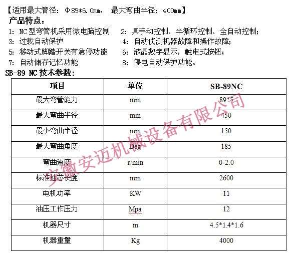 “安邁單頭液壓彎管機SB-89NC,馬鞍山小型數(shù)控液壓 彎管機廠家 質(zhì)量優(yōu)良”參數(shù)說明