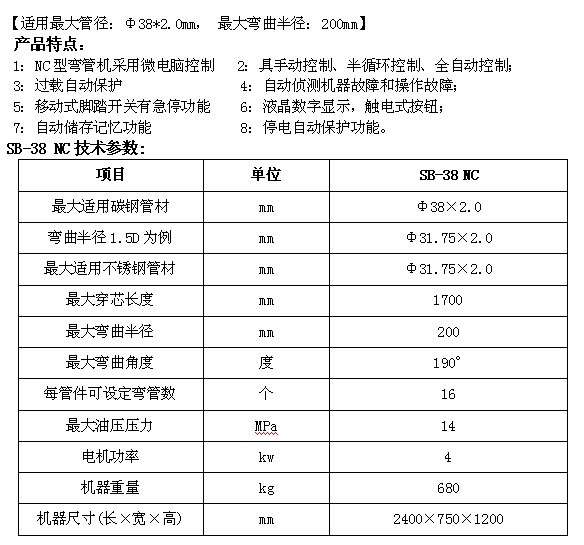 “安邁單頭液壓彎管機SB-38NC,數控液壓彎管機 質量優(yōu)良 高性價比”參數說明